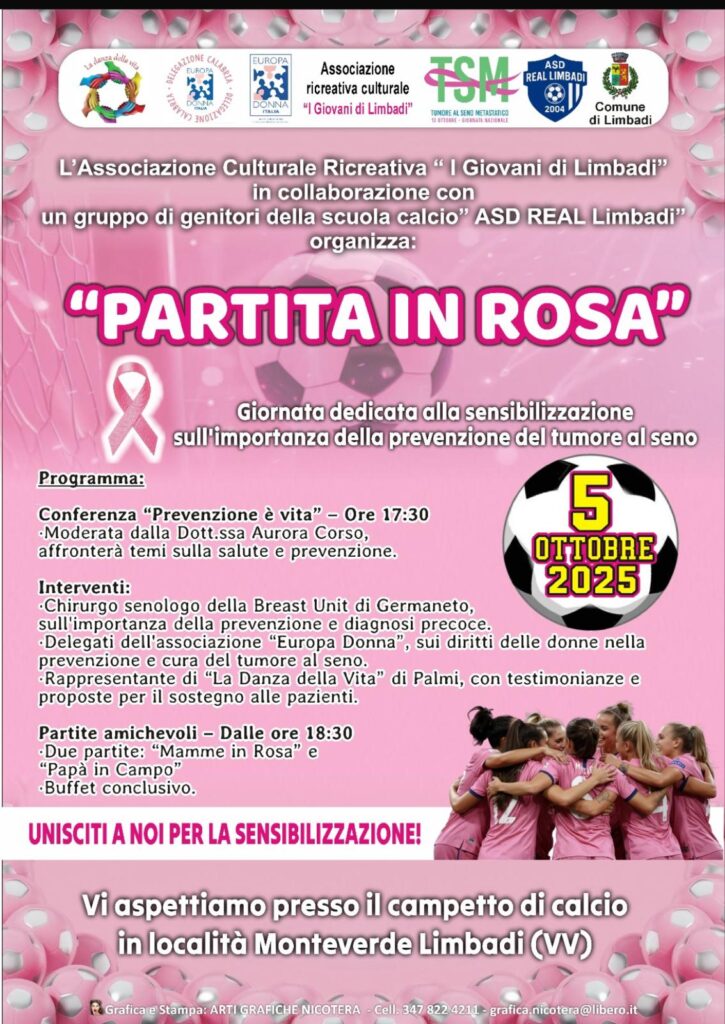 La manifestazione, “Partita in rosa”, promossa da varie associazioni fra le quali “I giovani di Limbadi”, si svolgerà presso il campetto in località Monteverde che sarà teatro, alle 18.30, di due partite di calcio, una che avrà come protagoniste le mamme dei bambini tesserati dalla scuola calcio Asd Real Limbadi, e l’altra i papà.