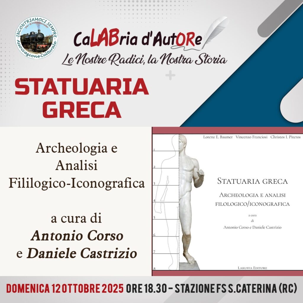 Presentazione del volume collettaneo “Statuaria greca. Archeologia e analisi filologico/iconografica”, a cura di Antonio Corso e Daniele Castrizio pubblicato da Laruffa Editore. Domenica 12 ottobre, ore 18:30 Stazione FS di Santa Caterina – Reggio Calabria nell’ambito del ciclo “Calabria d’Autore” a cura dell’Associazione “Incontriamoci sempre”