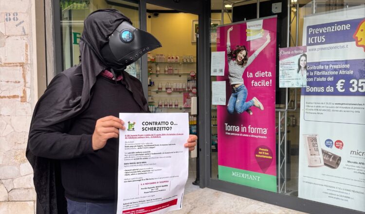 “Contratto o… scherzetto?”: flash mob della Filcams CGIL Calabria a sostegno dello sciopero delle lavoratrici e dei lavoratori delle farmacie private del prossimo 6 novembre.  In preparazione dello sciopero generale nazionale unitario dei dipendenti delle farmacie private, volantinaggi e presìdi davanti alle farmacie nei principali centri della regione. Al centro: rinnovo del CCNL, aumenti salariali, inquadramenti e diritti.