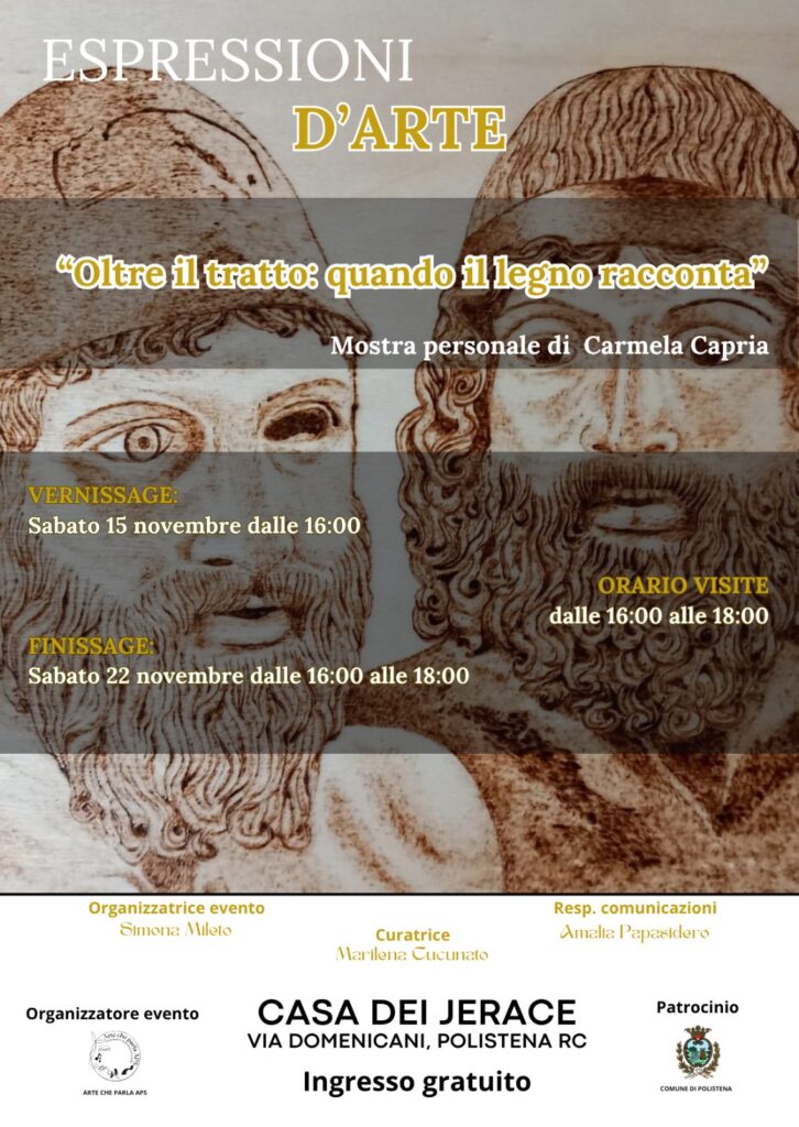 L’associazione di promozione sociale “Arte che Parla”, con il patrocinio del Comune di Polistena (R.C.), organizza, nell’ambito del progetto “Espressioni d’arte”, ideato dalla presidente e organizzatrice di eventi Simona Mileto, dalla socia e artista cosentina Marilena Cucunato, curatrice, e dalla socia Amalia Papasidero, responsabile della comunicazione, la mostra “Oltre il tratto: quando il legno racconta”, dell’artista Carmela Capria.