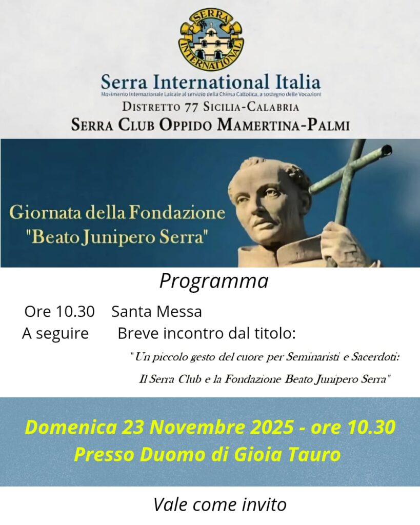 Quest’anno il Serra Club Oppido Mamertina Palmi, presieduto da Sabrina Ungheri  sarà presente la Domenica 23 novembre presso il Duomo di Gioia Tauro alle ore 10,30  e  presso la Chiesa del Crocifisso a Terranova Sappo Minulio alle ore 11,00