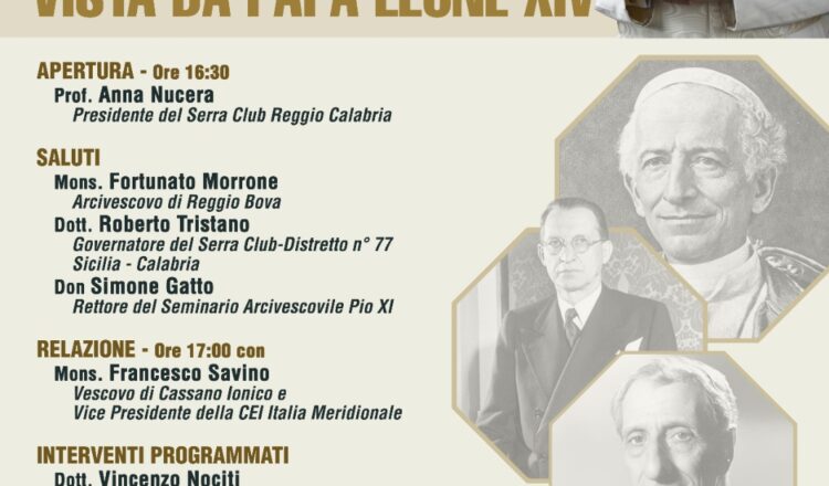 De “ I Cattolici e la Politica vista da Papa Leone XIV” nel nostro tempo ce ne parla S.E. Mons. Francesco Savino, vescovo di Cassano all’Ionio, Vice Presidente della CEI per Italia Meridionale, giovedì 4 dicembre alle ore 16,30 nell’Aula Magna del Seminario Arcivescovile Pio XI di Reggio Calabria. Correlatori saranno il giornalista scrittore Mimmo Nunnari, il dott. Vincenzo Nociti, presidente dell’Hospice di Reggio Calabria e l’on. Nino Foti, già deputato al Parlamento Italiano. L’incontro sarà aperto dalla professoressa Anna Nucera, Presidente del Serra Club Reggio Calabria seguita dai saluti di S.E. Mons. Fortunato Morrone, Arcivescovo di Reggio Bova, dal dott. Roberto Tristano, Governatore del Serra Club – Distretto n° 77 Sicilia – Calabria e da don Simone Gatto, Rettore del Seminario Pio XI. Seguirà dibattito. Ingresso libero.