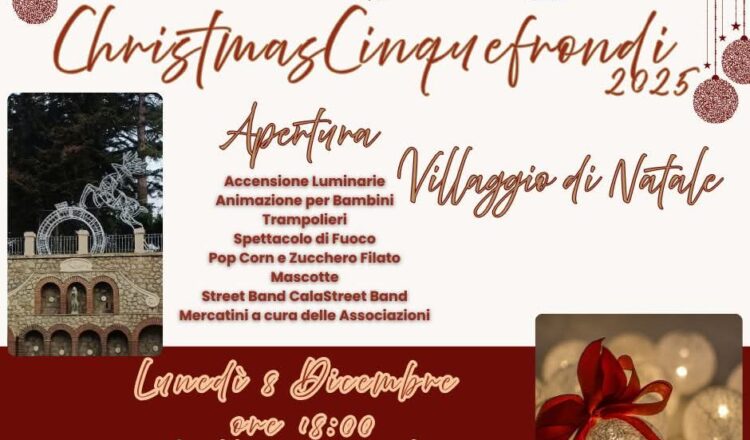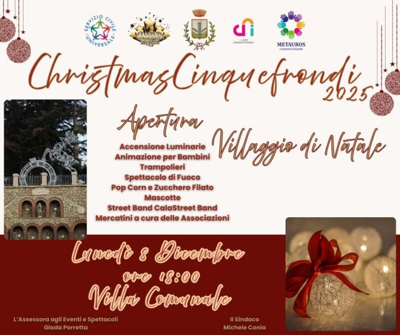 L’Amministrazione Comunale di Cinquefrondi è lieta di annunciare che domani, alle ore 18:00, nella splendida cornice della Villa Comunale, si terrà l’attesa inaugurazione dell’accensione delle luci del Villaggio di Natale.