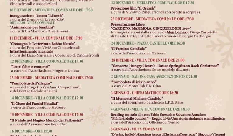 Cinquefrondi è pronta a vestirsi di luci, colori ed emozioni per un programma natalizio memorabile ed irreperibile. Il clima natalizio ha già avvolto l’intera comunità fin dal giorno 8 Dicembre, data in cui si è inaugurato il suggestivo Villaggio di Natale, una giornata senza precedenti e carica di emozioni che ha visto la presenza non solo dei nostri concittadini ma anche di cittadini provenienti da tutta la Piana. Tra luci scintillanti, profumi di festa e un’atmosfera fiabesca, il Villaggio ha dato ufficialmente il via a un mese di festa, con iniziative pensate per grandi e piccini. Un cartellone straordinario, frutto della sinergia tra Amministrazione Comunale, Associazioni del territorio e Città Metropolitana, capace di trasformare ogni giornata in un’occasione speciale.