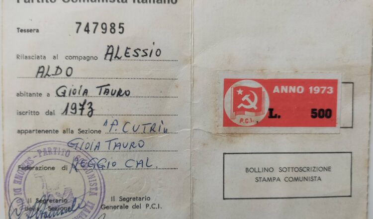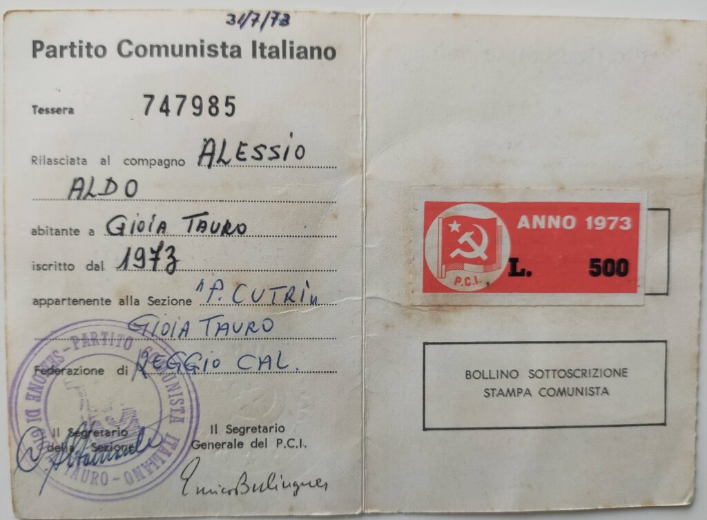 Il 31 luglio del 1973 decisi di recarmi nel centro cittadino alla ricerca della Sezione del P.C.I. In via Roma, all’altezza della Banca Commerciale Italiana, fermai un signore alto, minuto, con i baffi e con la sigaretta fumante in bocca. Gli chiesi se sapesse indicarmi dove si trovasse la sezione del P.C.I. Lui mi rispose subito di essere il segretario della Sezione “Peppino Cutrì” e mi chiese cosa volessi. Gli risposi, senza alcun indugio, che volevo iscrivermi al P.C.I. Così, dopo avermi chiesto chi fossi, quel signore, immerso in mezzo a una nuvola di fumo di una sigaretta nazionale, mi disse con tono fermo e deciso. “Vieni con me che ti porto alla Sezione che si trova qui vicino, in via Sarino Pugliese”. Lo seguii e, dopo avermi fatto visitare la Sezione, mi consegnò la mia prima tessera del P.C.I. con tanto di timbro e con la sua firma di segretario di sezione, accanto alla firma stampigliata del segretario generale del P.C.I., Enrico Berlinguer.