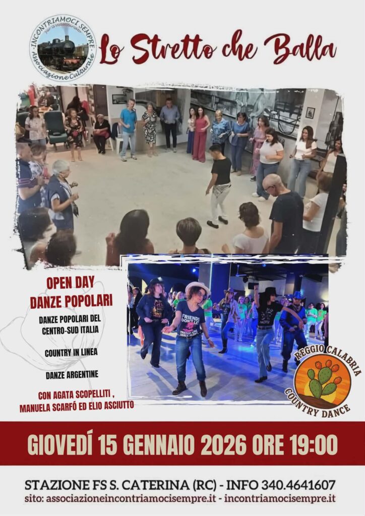 Si prevede il sold out per l’ Open Day dello Stretto che Balla , con la direttrice Agata Scopeliiti che da anni dirige questo laboratorio delle danze tradizionali del centro Sud Italia e , che a partire da giovedì 15 gennaio alle ore 19,30 saranno annunciate importanti novità nei laboratori settimanali, i quali vedranno la Sala del piccolo museo FS di RC S Caterina come crocevia delle danze popolari del nostro Sud e di altre tradizioni più lontani dal nostro paese.