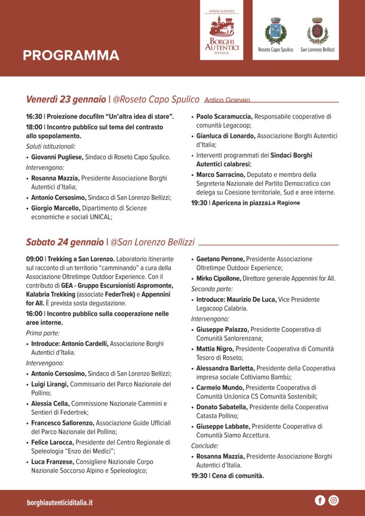- Ore 18.00 – Incontro pubblico sul tema del contrasto allo spopolamento, con saluti istituzionali del Sindaco di Roseto Capo Spulico Giovanni Pugliesee interventi di Rosanna Mazzia (Presidente Associazione Borghi Autentici d’Italia), Antonio Cersosimo (Sindaco di San Lorenzo Bellizzi), Giorgio Marcello (Dipartimento di Scienze economiche e sociali UNICAL), Paolo Scaramuccia (Responsabile cooperative di comunità Legacoop), Gianluca di Lonardo (Associazione Borghi Autentici d’Italia), dei Sindaci dei Borghi Autentici calabresi e di Marco Sarracino, Deputato e membro della Segreteria nazionale del Partito Democratico con delega su coesione territoriale, Sud e aree interne.