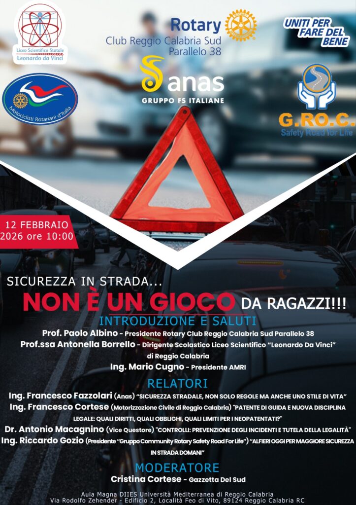 Il Rotary Club Reggio Calabria Sud Parallelo 38, l’Associazione Motociclisti Rotariani d’Italia e il “Gruppo Community Rotary Safety Road for Life – Sicurezza Stradale per la Vita, Italia”, in collaborazione con il Liceo Scientifico “Leonardo da Vinci di Reggio Calabria hanno hanno organizzato un importante Convegno: