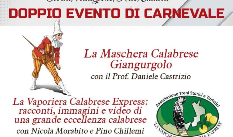 Per il Carnevale di domenica 15 febbraio 2026 con inizio alle ore 17,30 ,un doppio appuntamento per la rassegna Calabria D’autore alla stazione FS di RC S Caterina, con il Prof Daniele Castrizio che ci parlerà della Maschera Reggina : Giangurgolo ed il duo Morabito-Chillemi con l’amarcord della mitica Vaporiera Calabria Express.