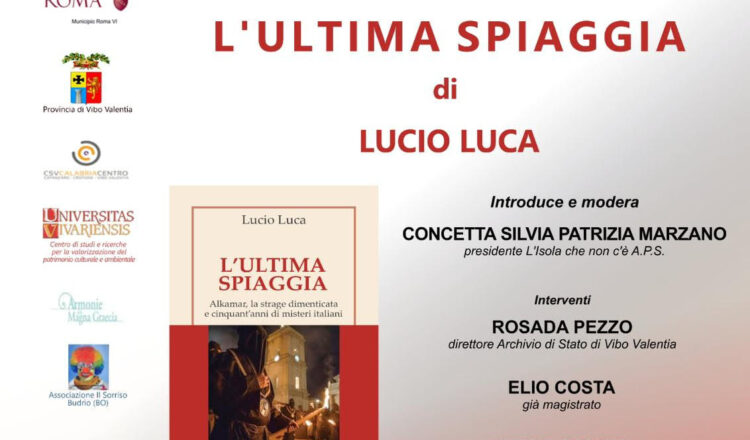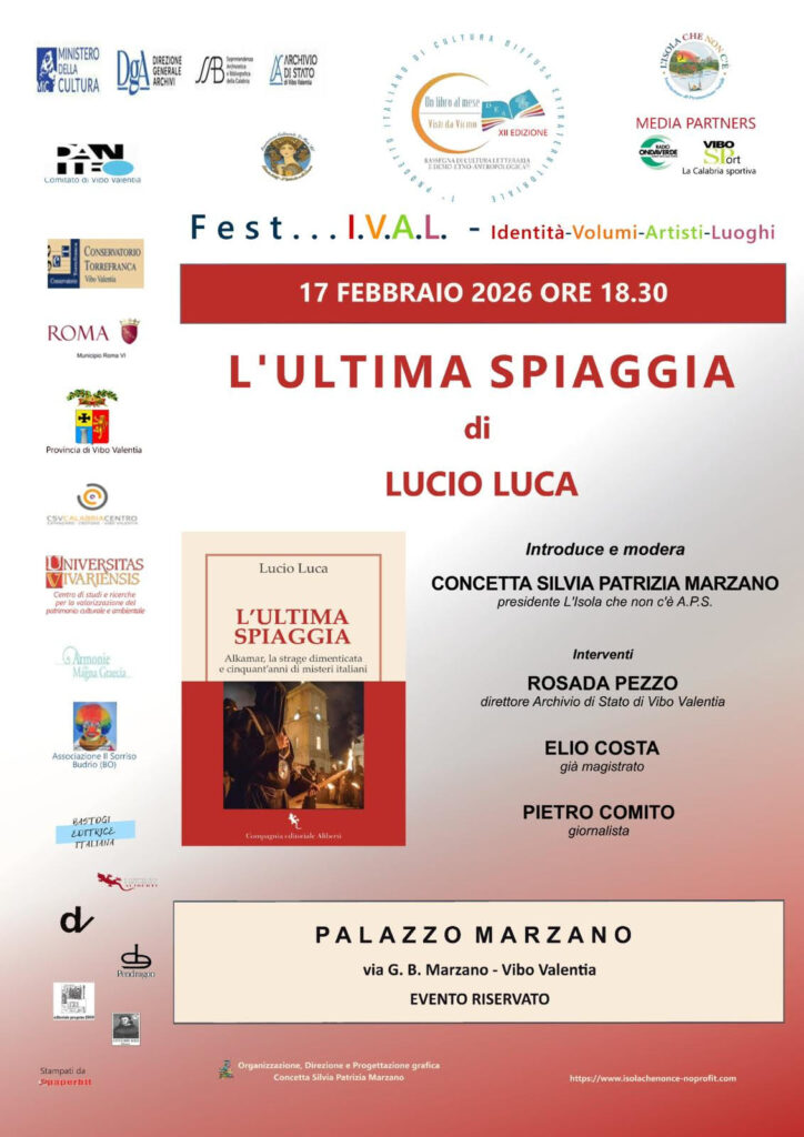 Martedì 17 febbraio 2026, ore 18:30, a Vibo Valentia, il giornalista Lucio Luca sarà ospite dell’associazione culturale “L’isola che non c’è A.P.S.”, con la presidente Concetta Silvia Patrizia Marzano, nel salotto di Palazzo Marzano, per presentare il suo ultimo libro “L’ultima spiaggia” ed. Compagnia Editoriale Aliberti. Lucio Luca scrive per il quotidiano “la Repubblica”, occupandosi di cronaca nera, giudiziaria, politica estera, sport e cultura. E’ autore del documentario “separati in casa” per l’indipendentismo in Europa.