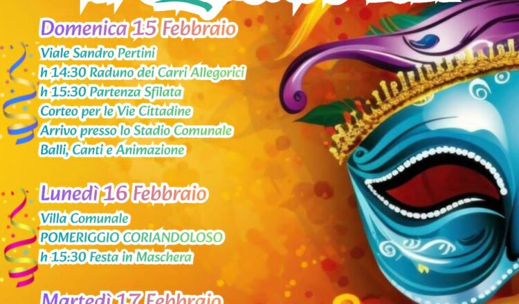 • Domenica 15 febbraio si terrà il grande raduno dei carri allegorici, che sfileranno per le vie cittadine tra balli, canti, animazioni e spettacoli coinvolgenti. Un’esplosione di colori e creatività animerà il centro cittadino, regalando a grandi e piccoli un pomeriggio di festa e condivisione.