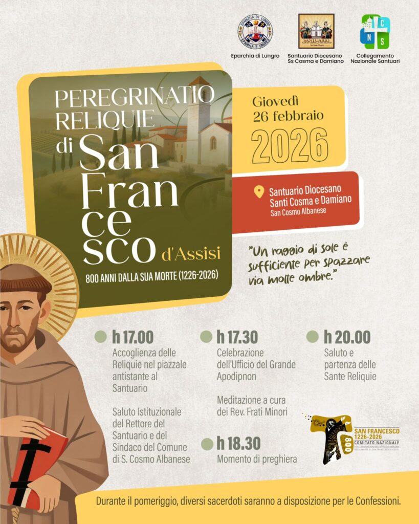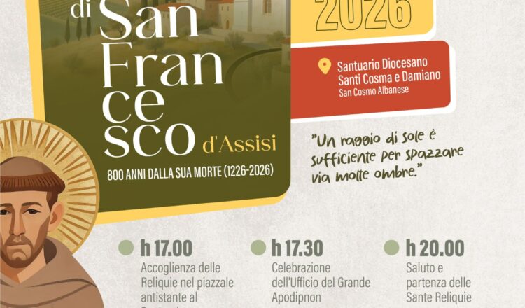 In occasione del transito delle reliquie di San Francesco a San Cosmo Albanese, per la celebrazione dell’ottavo centenario della morte del santo patrono d’Italia, il Santuario Diocesano dei Santi Cosma e Damiano accoglierà la reliquia del Poverello di Assisi, simbolo universale di pace, fraternità e amore peregrinante qui in Calabria.