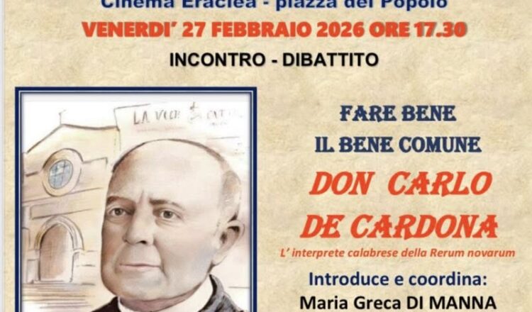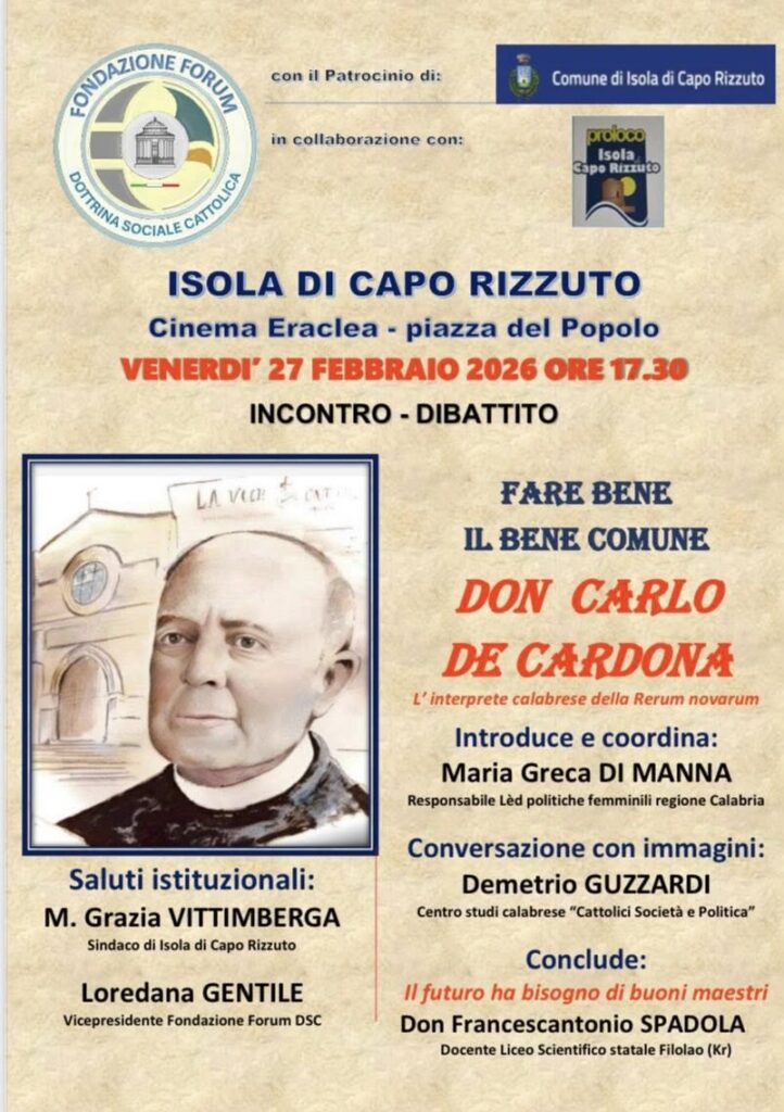VenerdΓ¬ 27 febbraio 2026, alle 17.30, il Cinema Eraclea di Isola di Capo Rizzuto (KR) ospiterΓ lβincontro βFare bene il bene comuneβ, che vuole rilanciare, in chiave attuale, lβereditΓ culturale e sociale di don Carlo De Cardona, figura emblematica del cattolicesimo sociale e interprete calabrese dei principi della Rerum novarum, la prima enciclica sociale, promulgata da Leone XIII nel 1891.