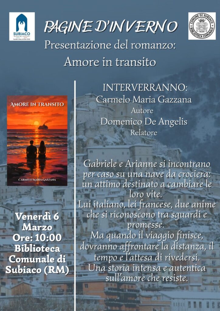Dopo le tappe di Terranova Sappo Minulio, Palmi, Taurianova – Capitale Italiana del Libro 2024 – e Bergamo, il tour di Amore in Transito prosegue e farà tappa a Subiaco venerdì 6 marzo 2026, alle ore 10:00, presso la Biblioteca Comunale, in Viale della Repubblica 26.