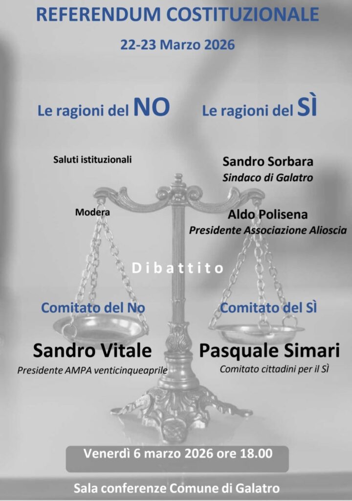 Venerdì 6 marzo presso la Sala conferenze del Comune di Galatro, si terrà un incontro di approfondimento sui temi del referendum sulla riforma costituzionale della giustizia, in programma il 22 e 23 marzo.