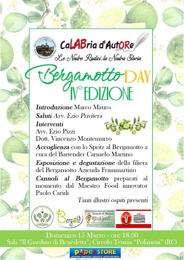 Calabria D’autore al Circolo Tennis Rocco Polimeni per la IV edizione del Bergamotto Day, classico appuntamento annuale con due protagonisti che ogni anno ci illustrano lo stato di salute del Bergamotto di Reggio Calabria, la filiera e la commercializzazione di un agrume che ha fatto la storia del territorio ,dell’area vocata di questo incredibile frutto e dei suoi derivati , essenza e tanto altro .