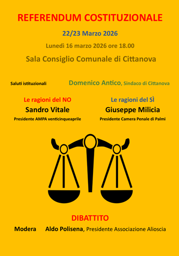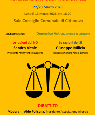 Lunedì 16 marzo 2026 si svolgerà a Cittanova, presso la sala del Consiglio Comunale, un confronto pubblico tra rappresentanti del Comitato del NO e rappresentanti del Comitato del SÌ, con la partecipazione di Sandro Vitale, Presidente di AMPA venticinqueaprile e di Giuseppe Milicia, Presidente della Camera Penale di Palmi. Il confronto, dopo i saluti istituzionali del Sindaco di Cittanova, Domenico Antico, sarà moderato da Aldo Polisena, Presidente dell’associazione ALIOSCIA.
