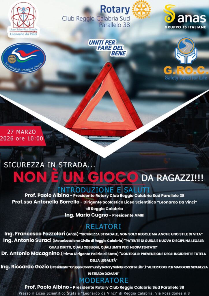 Il Rotary Club Reggio Calabria Sud Parallelo 38, l’Associazione Motociclisti Rotariani d’Italia e il “Gruppo Community Rotary Safety Road for Life – Sicurezza Stradale per la Vita, Italia”, in collaborazione con il Liceo Scientifico “Leonardo da Vinci di Reggio Calabria hanno organizzato il Convegno: