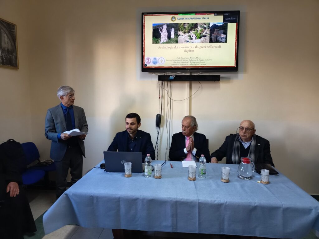 Il Quarto Incontro formativo organizzato dal Serra Club di Reggio Calabria, su: “Archeologia dei Monasteri Italo-Greci nell’area di Reghion”, tenuto al Seminario Pio XI dal reggino prof. Domenico Benoci, docente al Pontificio Istituto di Archeologia Cristiana della Pontificia Università “Regina Apostulorum” di Roma, Moderata dal giornalista Giuseppe Livoti, la riunione si è aperta con il ricordo del prof. Domenico Minuto, storico bizantinista e della cultura grecanica, recentemente scomparso. Don Antonino Denisi, Decano, di lui ha detto: “Lo dobbiamo ricorda vivo come Gesù risorto. Nel suo manifesto ha fatto scrivere le parole del Sommo Poeta Luce intellettual, piena d’amore; amor di vero ben, pien di letizia; letizia che trascende ogne dolore”. Quale necrologio più bello. Seguono i saluti del presidente ff, Mimmo Praticò e l’introduzione del vice presidente Programmi, dott. Rosari Idotta. Secondo il prof. Benoci, parlare di archeologia dei monasteri italo-greci nell’area di Rhégion è un paradosso per un archeologo, visto che essi possono essere individuati più per le fonti scritte che dalle stratigrafie. Perciò, il monachesimo reggino va letto nella storia di una capitale territoriale. Rhégion fu tra l’VIII e l’XI secolo fu uno dei principali nodi politico-amministrativi della Calabria e la città bizantina più importante del Mezzogiorno d’Italia. Un punto di transito verso la Sicilia e verso l’Oriente. Sede dello Stratega e centro di una fiscalità complessa. Il Brébion mostra come la Metropolia di Reggio partecipasse pienamente ai meccanismi amministrativi ed economici dell’Impero Bizantino. Il Brétion è la chiave interpretativa primaria per comprendere il rapporto tra Chiesa e territorio e potere nella Calabria bizantina. Importanti sono i bios dei santi Italo-greci utili per costruire la geografia monastica e insediativa della diocesi di Reggio. Tra questi il prof. Benoci ne cita solo alcuni e i più conosciuti. S. Elia Speleota, in riferimento al praetorim di Reggio. Esso definisce la centralità politico-amministrativa della città di cui faceva parte il castrum di S. Agata. S. Elia il Giovane in riferimento al settore meridionale e sud-orientale del territorio reggino del quale faceva parte il castrum di Pentidattilo. S. Nicodemo di Kellarana, in riferimento all’area ionica meridionale. S. Filareto di Seminara, in riferimento all’aria settentrionale. La presenza monastica si addensava lungo le valli fluviali, in rapporto con gli assi viari interni e con le aree di maggiore sfruttamento produttivo. Particolarmente eloquente è il settore settentrionale, tra Favazzina, Catona, Gallico e S. Agata. Qui si addensa una costellazione di monasteri che comprende S. Maria di Mirtilo, Santa Maria del Campo Superiore, S. Pietro di Fiumara di Muro, Santa Lucia, S. Martino, Sant’Epifanio de Kentrina, S. Domenica e S. Nicola a Gallico Superiore, Santa Marina di Mannoli, San Pietro di Zosimo ad Arasì, Santa Maria di Terreti, Santa Maria Spatharéa Strutu, San Nicola di Giunchina, Santi Quaranta e San Nicola di Calamizzi. A questa abbazia Basilio Pediadita, funzionario imperiale, ha donato un skaramangion (tunica) in tessuto di porpora, E ancora il monastero di S. Giovanni Telogo nel comprensorio di S. Niceto, di S. Angelo del Campo, San Fantino e Balsamio e S. Giorgio nella Valle del Tuccio. I referti ritrovati sono pochi e sparsi ma preziosi. Nell’area di Calanna sono documentati un enkolpion (Collana) cruciforme bronzo con iscrizione greca, un amuleto di steatite e delle monete fra il IX e inizio X secolo. A Valanidi alcune sepolture hanno restituito corredi e monete di Leone VI e Romano I. Per il pof. Domenico Benoci sarebbe interessante poter passare da una geografia storica dei monasteri a una vera archeologia dei monasteri. Ma sicuramente si può dire che il monachesimo italo-greco nell’area di Réghion non fu un fenomeno marginale anzi fu un potente mezzo di civiltà e di cultura. L’incontro è stato chiuso dall’intervento da don Simone Gatto soffermandosi con particolarità sul monachesimo interiorizzato.