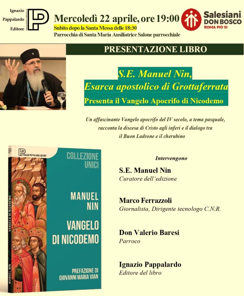 Il Vangelo di Nicodemo, sarà presentato mercoledì 22 aprile alle 19:00 presso la Basilica di Santa Maria Ausiliatrice al Tuscolano (p.zza di Santa Maria Ausiliatrice, 54, zona Furio Camillo).