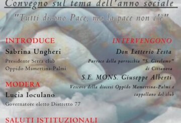 Sabato 18 ottobre a Cittanova presso la “Chiesa Matrice”, si terrà un importante evento organizzato dal Serra Club Oppido Mamertina-Palmi presieduto da Sabrina Ungheri. Tema dell’evento: ”Tutti dicono Pace, ma la Pace non c’è”. Dopo l’introduzione della presidente Ungheri; interverranno: Don Letterio Festa, Parroco della Parrocchia “San Girolamo” di Cittanova e Mons. Giuseppe Alberti Vescovo […]